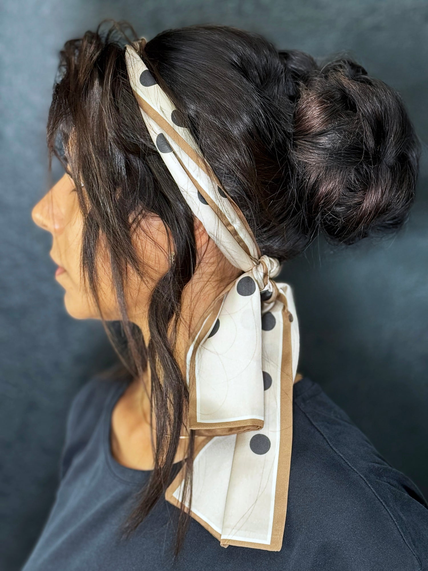 Playful yet timeless, this elegant polka dot satin square scarf adds a touch of sophistication to any hairstyle. Tie it as a chic headband, wrap it around a ponytail, or weave it through a braid for a polished finish. The classic polka dot pattern brings a refined, feminine charm that transitions seamlessly from casual days to elegant evenings.