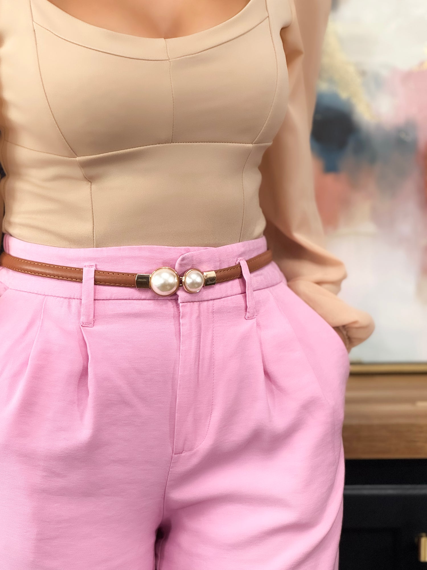 Transform any outfit into a statement of refined sophistication. The slim, sculpted design contours the waist with grace, while the pearls add a subtle, luxurious shimmer that catches the eye. Perfectly balancing timeless charm and modern flair.